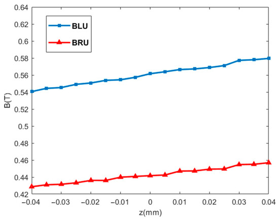 The BLU curve in Figure 4 is the relationship between the magnetic flux in the upper left air gap and the levitation position of the MC; the BRU curve is the relationship between the magnetic flux in the upper right air gap and the levitation position of the MC. From Figure 4, it can be seen that changes in the air gap on the upper part of the MC will lead to changes in air gap flux density.