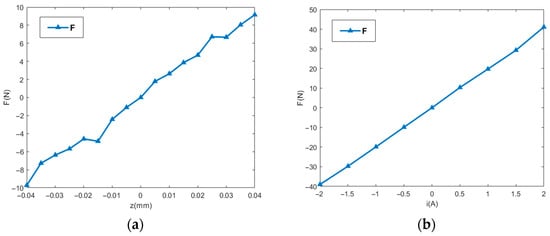 The MC is temporarily fixed to the z-direction micro-motion platform, and adjust the height of the MC. The resolution of the z-direction micro-motion platform is 5 μm. The relationship between the height change of the MC and the air gap flux density can be detected. The detection conditions are that the current of the horizontal thrust coil i = 0 A and zl = zr. The detection results are shown in Figure 4.