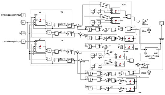 The standard ADRC controller is capable of controlling second-order systems and decoupling effectively [2,12,19,20,21]. However, the levitating system of the MR is a four-input two-output system, which is different from the system in the literature. This paper simplifies the levitating system into a two-input two-output system using Equations (50) and (51). And improvements have been made to the ESO of ADRC, as shown in Equation (57). The improved ADRC can be applied to the suspension system of magnetic levitation rulers. Through simulation and experiments, it has been proven that the suspension control system of the magnetic levitation ruler can quickly follow the set value, effectively suppress sudden interference and white noise, have small overshoot, and have good dynamic and static characteristics as well as robustness.