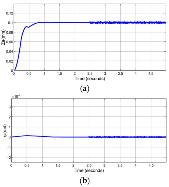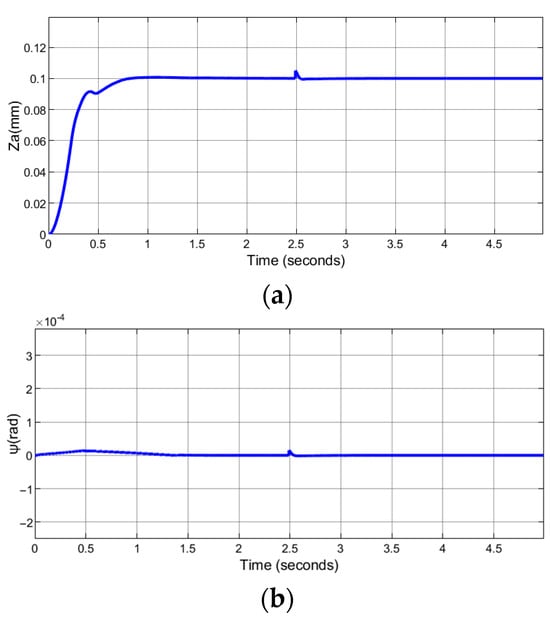 In addition, when the MC moves along the y-axis, the magnetic field in air gaps will fluctuate, causing changes in the levitating position [1]. Therefore, at t = 2.5 s, a position disturbance with za = 0.008 mm is used to replace the fluctuation of the magnetic field in air gaps to simulate the disturbance to the levitating system. The simulation results are shown in Figure 11.
