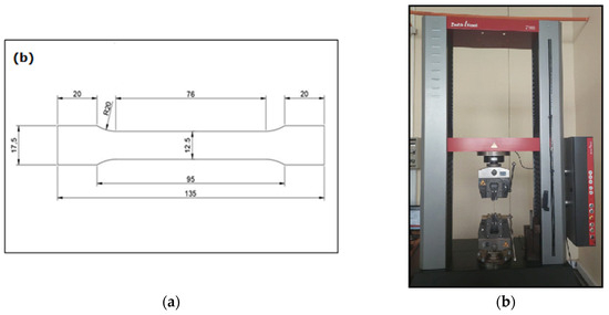 The ASTM E8 standard [40] was adhered to for the mechanical characterization, focusing on tensile properties. Tensile tests were conducted on three specimens for each direction: DR (0°), DD (45°), and TD (90°) with respect to the rolling direction (RD). Samples were prepared to a width of 12.5 mm following the sheet-type specifications outlined in the standard (Figure 1a). Utilizing a universal tensile testing machine Zwick/Roell with a maximum capacity of 100 kN, the tests were executed under displacement control at a grip speed of 2.5 mm/min (~10−3 s−1) (Figure 1b).
