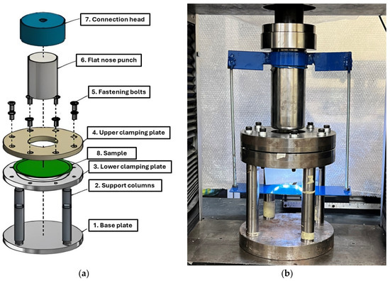 The Marciniak tests were conducted to assess the formability characteristics of the material, following the guidelines outlined in the ISO 12004-2 standard [14]. The setup comprised a 100 mm diameter flat punch with an edge radius of 10 mm, conforming to standard specifications (See Figure 2), where Figure 2a indicates the different parts of the equipment; base plate (1), support columns (2), lower clamping plate (3), upper clamping plate (4), bolts (5), flat nose punch (6), connection head to tensile machine (7), and as an example, balance biaxial sample (8). The other equipment dimensions were scaled proportionally to the punch diameter. Mounted on the universal tensile test machine described in the universal tensile testing machine model WDW-200E with a capacity of 200 (kN), the tests were executed at a crosshead speed of 2.5 mm/min, with the entire test surface recorded in full HD video, allowing for image extraction at 0.1 s intervals. To prevent interference between the punch and the sheet metal, an 85–15 brass mask with an outer diameter of 200 mm and an internal diameter of 36 mm was interposed. Additionally, to mitigate friction, a 0.4 mm thick sheet of polytetrafluoroethylene (Teflon) and a layer of molybdenum-based spray lubricant were employed.