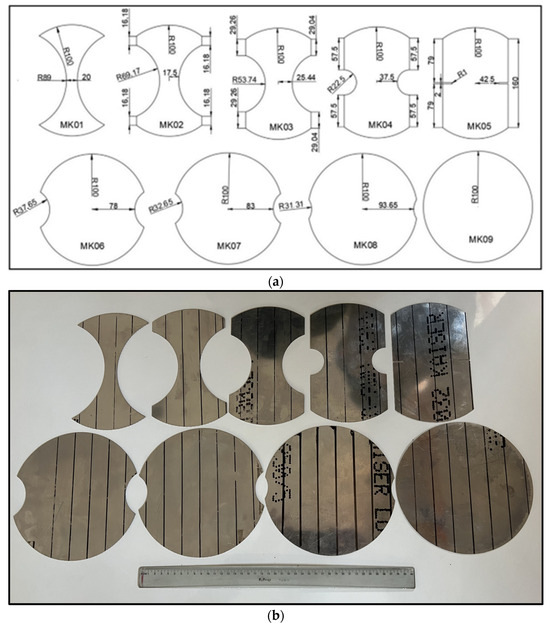 Specimens for the construction of the forming limit curve: (a) sample geometries; (b) specimens selected for sample in rolling direction.