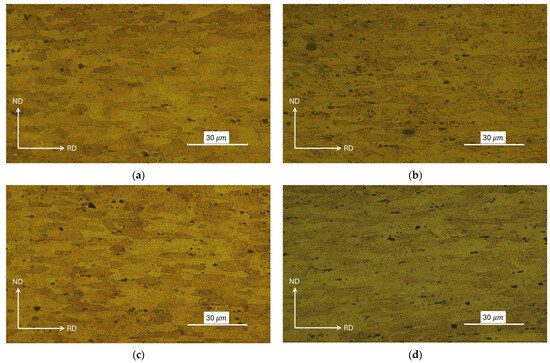 Figure 4 confirms the relationship between the rolling direction not only for the as-received material but also for the three applied strain paths. In all four images, elongated grains in the rolling direction are observed. It is important to note that Figure 4 only shows the RD-TD plane at 0 degrees with respect to rolling direction, subjected to different deformation routes. Furthermore, although three different directions relative to the rolling direction were tested, the macroscopic results indicate a certain level of independence from the grain direction, as confirmed by the anisotropy results (from tensile tests in different directions) and the similarity of the forming limit curves.