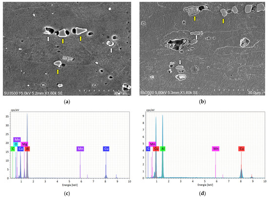 SEM images and EDS analysis; (a) as-received material; (b) balanced biaxial strain sample; (c,d) EDX analysis of intermetallic phases white arrows , yellow arrows .