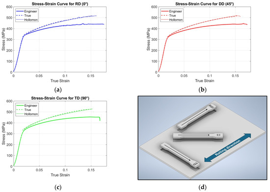 Stress–strain engineer, true and Hollomon curves; (a) RD; (b) DD; (c) TD; (d) schematic of tensile samples in the three directions analyzed.