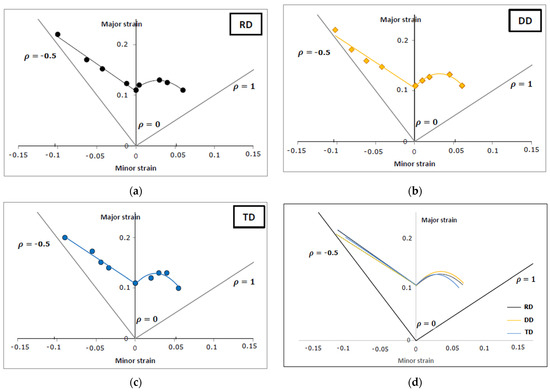 Forming limit curves at different loading orientations with respect to the rolling direction (RD): (a) RD; (b) DD; (c) TD; (d) comparative forming limit curves at RD, DD and TD directions.