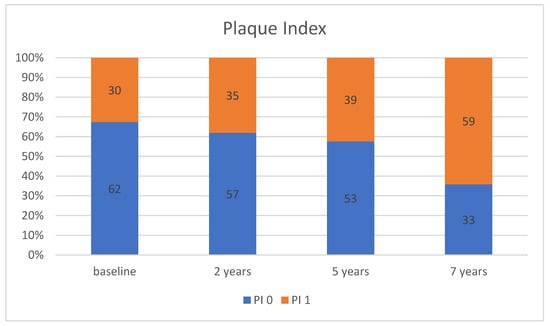 During the 7-year observation period, mucositis was observed in 8 patients and 13 implants. No peri-implantitis was recorded. All inflammations were successfully treated with interceptive supportive therapy, consisting of professional cleaning followed by 0.2% chlorhexidine mouth rinses, three times per day for two weeks. Data on PI and MBI parameters at the loading time and after two, five, and seven years of function are presented in Figure 2 and Figure 3. Briefly, PI values remained stable after 2 and 5 years of follow-up, while there was a worsening of values after seven years of follow-up: in fact, most of the implants (59 out of 92) presented plaque, and this value was almost doubled compared to the 5-year follow-up. A similar trend was seen for MBI values. During the follow-up years, the MBI value of 2 increased from 4 implants to 7, 10, and 18 implants, in the follow-ups to 2, 5, and 7, respectively. The MBI value of 1 went from 25 to 28, 29 and 37, while the MBI value of 0 went from 63 to 57, 53 and 37.