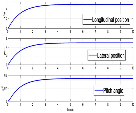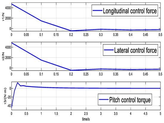 Using the “Xin Hongzhuan” ship from Dalian Maritime University as the simulation object, performance verification of the terminal sliding mode controller optimized by JLSCOA is conducted in an ideal environment. The initial position of the ship is set to [0 m, 0 m, 0°], and the desired position is set to [5 m, 5 m, 10°]. Other controller parameters are set as . The simulation time is 600 s. Figure 4, Figure 5 and Figure 6 show the results. Figure 4, Figure 5 and Figure 6 are the curves of the change of position, speed, and control force of the ship’s three freedoms.