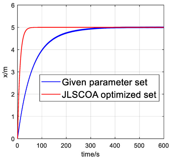Figure 7, Figure 8 and Figure 9 show the position variations of the ship in three degrees of freedom. From the figures, it can be seen that the ship equipped with the terminal sliding mode controller optimized by the JLSCOA algorithm can complete the positioning process more quickly, with an average position change time of approximately 300 s faster than that of the given parameter set.