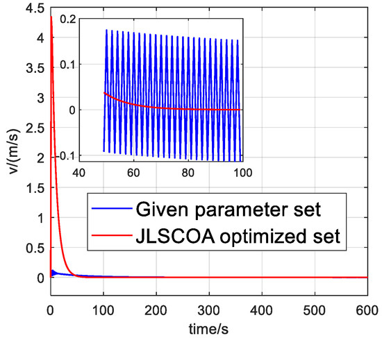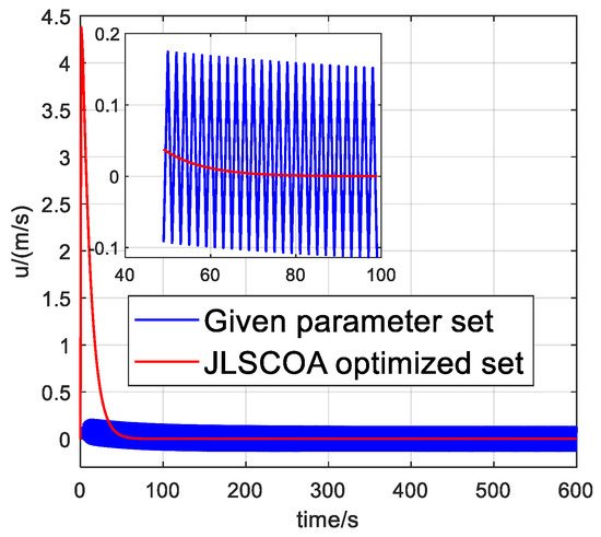Figure 10, Figure 11 and Figure 12 depict the velocity variations in three degrees of freedom. The results indicate that the given parameter set exhibits significant velocity oscillations and smaller control forces, while the JLSCOA optimized set shows larger control forces with almost no velocity oscillations.