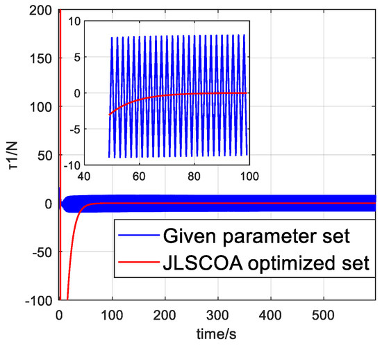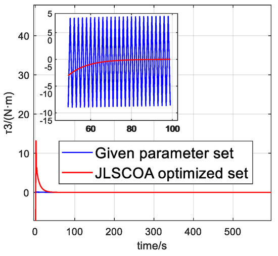 Figure 13, Figure 14 and Figure 15 illustrate the variations in the output force and torque of the terminal sliding mode controller. Analysis reveals that the control force of the given parameter set oscillates significantly, whereas the JLSCOA-optimized set exhibits minimal oscillation.