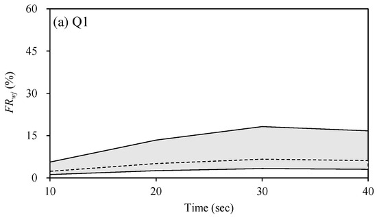 where is the flood risk value for the i flood risk analysis index; is the weighting value for the jth weighting scenario; is the weighted flood risk value. Since a reliable objective criterion for determining the appropriate weights for these indices was insufficient, 45 weighting scenarios were generated to address potential bias in the assignment of [40]. These scenarios were created by combining weighting values ranging from 0.1 to 0.6 for each index, ensuring that the summation of in each scenario equals one. In Figure 15, the upper and lower limit lines are the maximum and minimum values of the weighted average flood hazard risk (), and the dashed line is the averaged values of for 45 weighting scenarios. The maximum values of were 6.6%, 22.8%, and 30.8% in Cases Q1, Q2, and Q3, respectively. The standard deviation of weighted average values in Case Q1 ranged from 0.9 percentage points to 3.34 percentage points over time. This range broadened in Cases Q2 and Q3, with standard deviations of 3.7 to 5.7 percentage points and 4.2 to 5.8 percentage points, respectively, indicating increased uncertainty in the flood risk assessment results. The upper limit was obtained when had the maximum weighting value of 0.6, while the lower limit appeared when had the maximum weighting. The upper limit is farther from the average value of than the lower limit, indicating an increase of uncertainty when using . The averaged indicates that the rate of flood risk increase accelerates until 30 s after flood occurrence, after which the rate begins to decrease. These averaged values of was close to the assessment results using compared to other indices, with an average difference of 27.3% between the averaged values of and across all cases. It implies that provides reasonable safety analysis results compared to other indices. These results are in line with Musolino et al. [25] and Kvočka et al. [41], where the mechanical analysis based on physical analysis is preferred over empirical formulas for analyzing evacuation safety.