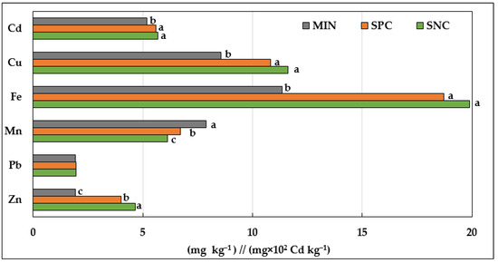 Fertilization treatments did not affect soil Pb availability (DTPA extraction), with average values of 1.9 mg Pb kg−1, while they did for Cd, Cu, Fe, Mn and Zn (Table A1). Sewage sludges increased Cd, Cu and Fe availability in the soil when compared with MIN treatment. Availability ranged from 52 to 57 µg Cd kg−1, from 8.5 to 11.6 mg Cu kg−1 and from 11.4 to 19.9 mg Fe kg−1. The availability of Zn increased in the following order: MIN< SPC < SNC treatments, from 1.9 to 4.6 mg Zn kg−1, while Mn availability increased following an inverse order, from 6.1 mg Mn kg−1 in SNC to 7.9 mg Mn kg−1 in MIN (Figure 1).