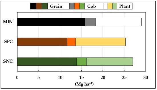 The yields of the grain, the cob and the rest of the plant biomass were not significantly different based on the fertilization treatments applied (Table A2). The average biomass yield values were 13,779, 2293 and 11,024 kg ha−1 for the grain, the cob and the rest of the plant, respectively (Figure 2).
