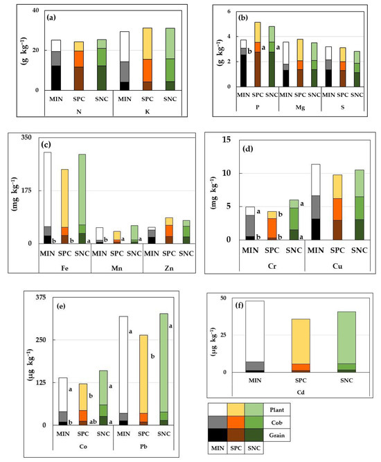 Average concentrations of N and K (a); P, Mg and S (b); Fe, Mn and Zn (c); Cr and Cu (d); Co and Pb (e); and Cd (f); in different parts of maize plants for each treatment (MIN: mineral; SPC: sewage sludges, P criterion; SNC: sewage sludges, N criterion). In grain, for Co, Cr and Fe; in cob, for P and Mn; and Co, Cr and Pb in plant; means with different letters are significantly different according to the DMRT (α = 0.05).