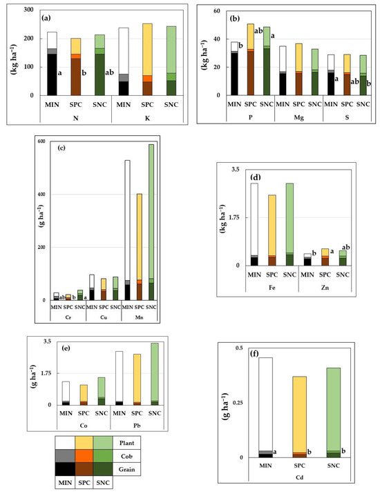 Accumulated average extractions of N and K (a); P, Mg and S (b); Cr, Cu and Mn (c); Co and Pb (d); Fe and Zn (e); and Cd (f); from average extractions in different parts of maize plants, and for each treatment (MIN: mineral; SPC: sewage sludges, P criterion; SNC: sewage sludges, N criterion). In grain, for Cr, N and S; in cob, for Cd; and in straw, for P and Zn; means with different letters are significantly different according to the DMRT (α = 0.05).
