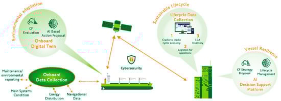 An IDTP strives to enhance adaptability and resilience in an ever-changing operational setting, while promoting sustainable vessel operation to adopt a predictive approach. This maintenance approach heavily relies on Internet of Things (IoT) sensor measurements and integrated digital twins based on AI to estimate the condition of a vessel’s critical systems, such as its main engine and others, based on data-driven methods that perform timely prediction. A comprehensive illustration of the extended IDTP concept is provided in Figure 1.