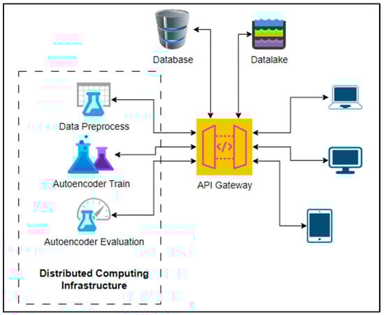 The deep learning platform illustrates the database and data lake, the API gateway, the end users, and the distributed computing infrastructure used to train autoencoders.