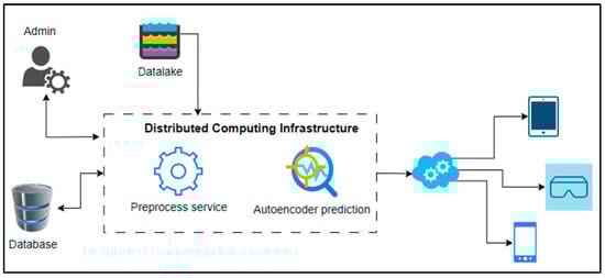 The second focus area is a real-time operational module, as depicted in Figure 3. This module functions continuously and without interruption, ensuring timely assistance in decision-making processes. The trained autoencoders from the decision support platform aim to forecast the conditions of the vessel’s subsystems and identify any anomalies. The objective is to create a system capable of managing extensive data through distributed processing, providing real-time predictive analytics to various users of the platform. Oversight of the system is maintained by an administrator, who is responsible for the data lake and performs administrative tasks such as managing, monitoring, and configuring the deployed DL models. The database is employed to gather real-time data from the vessel, which subsequently enters the distributed computing infrastructure. Within this framework, two main services operate: the preprocess service, which prepares the data and converts them into an appropriate format for analysis, and the autoencoder prediction service, which receives the formatted data for real-time anomaly detection. The analysis results are accessible to end users through the cloud.