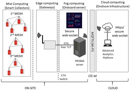 A comprehensive wired network was implemented at the power plant to facilitate wireless data transmission to the gateway. This setup incorporated signal collectors and power analyzers, while the wireless communication was based on the IEEE 802.15.4 Zigbee protocol, specifically designed for maritime applications. The gateways interfaced with the Prisma server through Ethernet and raw TCP, employing WebSocket protocols to ensure data security before transmitting information to the cloud for processing and visualization. The power analyzer was capable of monitoring a three-phase, four-conductor system with precision of 10 mA at a sampling frequency of 20 kHz, calculating effective values and other metrics every five minutes, with adjustable rates for users. Although Prisma Sense was utilized on an older, mostly intact vessel for two years, the validation of the algorithms was based on data obtained from a system simulator linked to the smart collectors via TCP/IP.
