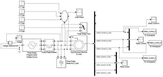 The simulation model utilized a 4 kW, 3-phase squirrel-cage induction motor (IM) and a fault block to replicate faulty operations. Figure 5 displays the finalized model, while Table 1 outlines the key components, including the IM and fault block [].
