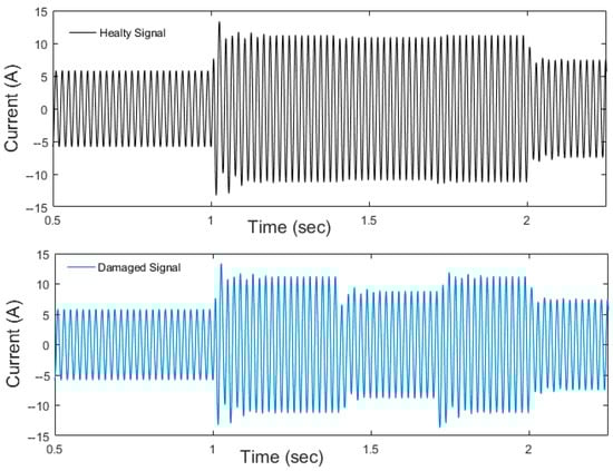 Figure 6 illustrates the signals observed in both the healthy and damaged states, revealing that the transient phase at the start of the motor’s operation results in an overshoot. Furthermore, the fluctuations in the current time series align with the load pattern. The current signal for the damaged 3-phase motor, as shown in Figure 3, emphasizes the variations occurring between 1.4 and 1.7 s, which are indicative of the damage effect.