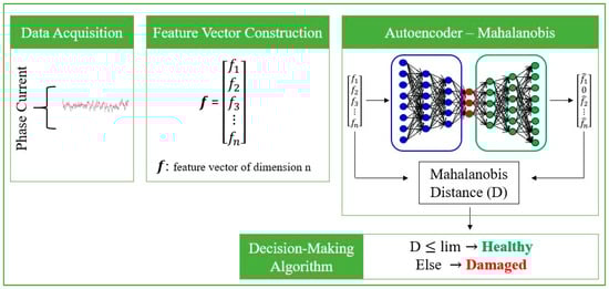 Previous studies have explored the use of autoencoders in various applications, including an LSTM autoencoder for real-time pipeline leak detection using accelerometer signals and a framework for the identification of corrosion in hydropower facilities, achieving over 80% true positive detection [,]. Recent studies have shown that autoencoders effectively identify damage in electric motors. A comparative analysis found that MLP autoencoders outperformed MLP, CNN, and LSTM architectures in detecting damage from vibration signals, achieving an AUC of 99.11% []. Additionally, research developed a hybrid health indicator using current and vibration signals to monitor bearings and stator windings in motors, demonstrating excellent performance across various load conditions []. CNN autoencoders were also used for the rapid identification of electrical damage in induction motors, achieving over 95% accuracy. In our previous works, this unsupervised methodology proved to be especially advantageous in sectors such as maritime, where instances of damage data are frequently limited []. To this end, PRISMOID aims to develop a modular and scalable digital twin platform capable of collecting large amounts of heterogenous data from different sensors and systems onboard and provide the software with the means to reliably use the data onboard and onshore for early warnings and decision support reasoning. The present research focuses on the anomaly detection framework developed during the project, which utilizes autoencoders in conjunction with the Mahalanobis distance to distinguish between healthy and compromised states by analyzing time series current data, with a specific focus on damage occurring in stator windings [].