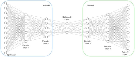 The autoencoder is composed of five sequential parts: the input, the encoder, the bottleneck, the decoder, and the output (Figure 8). The layers of the encoder and decoder are mirrored via the bottleneck, hence resembling an hourglass. The data are passed through the encoder, which has a descending number of neurons, and reach the bottleneck layers, where the data are compressed in a low-dimensional latent space. Subsequently, the decoder uses the data in the latent space to reconstruct the input of the model as the output. The number of layers in the encoder and decoder is selected to be two based on our previous study [].