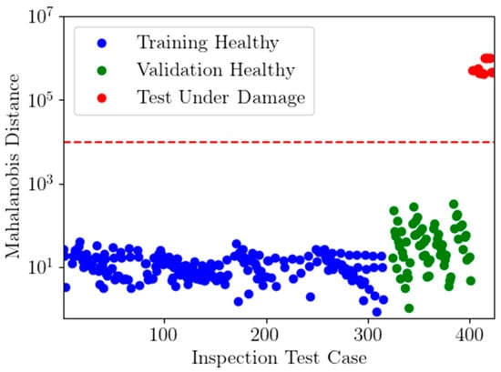 The outcomes of the damage detection framework are illustrated in the scatter plot in Figure 9. In the scatter plot, a user-defined threshold of 10,000 is depicted with a red dotted line. The distances pertaining to healthy feature vectors, either training (blue color) or validation (green color), are under the threshold, while the feature vectors under damage (red color) result in distances that are over the threshold. This translates into detection accuracy of 100%. In Figure 4, it is worth noting that the interval between the distances of the healthy and damaged states is significant, indicating the high detectability of the damage and clear separability between the healthy and damaged states.