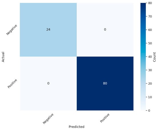 Figure 10 shows the confusion matrix, indicating that the model successfully identified only true positives and true negatives, as the results are concentrated along the diagonal. In addition, Table 4 presents, in a quantitative way, the values of different measures for the sensitivity, precision, and accuracy of the framework for the two different values of white noise used: 60 and 78 Eb/No.