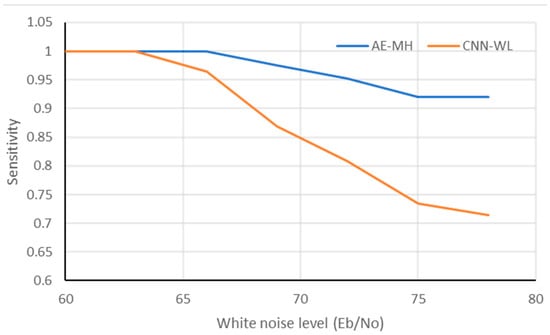 Comparison of sensitivity between the AE-MH (blue) and the CNN-WL (orange) frameworks, for different levels of white noise.