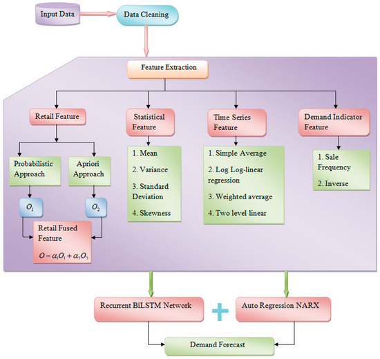 This study aims to use machine learning techniques to predict demand in the supply chain. The first step involves gathering input data related to the supply chain, which are then cleaned to remove any inconsistencies, errors, or irrelevant information. The cleaned data are then used to extract features, with a particular focus on retail features. Probabilistic and Apriori approaches are used to extract retail-specific features, which are then combined into a single retail feature using a weighted sum. Along with retail features, statistical features like mean, variance, standard deviation, and skewness over time are also extracted. Time series feature extraction employs methods such as simple average, log–log linear regression, weighted average, and two-level linear model to identify temporal patterns in the data. Log–log linear regression uses logarithmic transformations to analyze and measure the rate of change over time, giving a more nuanced understanding of trends [45]. The weighted average assigns varying weights to data points based on their importance, resulting in a more precise representation of evolving patterns. Two-level linear model methods use linear modeling at two levels to analyze complex relationships within the data. These techniques collectively contribute to accurately forecasting future demand in the dynamic context of the supply chain by identifying and understanding time-dependent trends. Feature extraction for demand indicators involves considering features related to sales frequency and inverse sales frequency. These extracted features then serve as inputs to a recurrent BiLSTM network and NARX. The recurrent BiLSTM network is utilized in the initial stage of demand forecasting to capture temporal dependencies and patterns in the data. The NARX model with autoregression considers historical data and external factors to anticipate future demand in demand forecasting. To enhance the accuracy and reliability of the forecast results, a combination of forecasts from the recurrent BiLSTM network and NARX model is used. This fusion approach is presented in the proposed framework. The architecture of the developed demand forecasting model is presented in Figure 1.