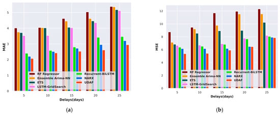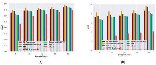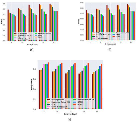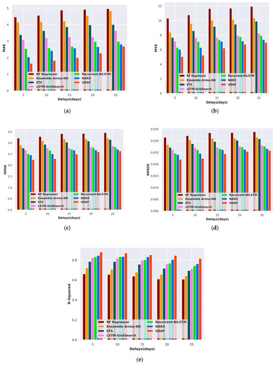 The existing methods employed for demand forecasting, such as RF regressor, ensemble ARIMA–NN, distributed RF-GB, LSTM grid search, recurrent BiLSTM, and NARX, have some limitations. RF regressor [41] can be prone to overfitting and there are difficulties regarding interpretability, whereas the developed UDAF model can resolve interpretability issues, attaining high performance on various datasets. Ensemble ARIMA–NN [49] is also prone to overfitting and cannot hold for time series data, whereas the developed UDAF model reduces the risk of overfitting by reducing the number of parameters in the model. The training of the LSTM grid search [50] is expensive. In recurrent BiLSTM [43], the BiLSTM can increase the model complexity. The developed UDAF model reduces the model complexity and attains efficient results by considering data beyond historical data. NARX models [44] assume that the future output depends only on past inputs, which may not hold in all cases. In order to solve these above issues, the proposed UDAF model is developed, combining recurrent BiLSTM and NARX, which benefits from the complementary strengths of these two approaches. The BiLSTM captures temporal dependencies, while NARX incorporates autoregressive features and can look beyond historical information and account for external factors that may affect demand. This synergy leads to improved forecasting accuracy and robustness compared to individual methods and reduces the complexity of the model. The results of the demand forecasting models are analyzed in Table 1, Table 2 and Table 3, indicating that the suggested model performs better than others in terms of MAE, MSE, RMSE, RMSSE, and R-squared. In particular, the proposed UDAF model showcased significantly lower values for MAE, MSE, RMSE, RMSSE, and R-squared, of 1.73, 4.14, 2.03, 0.020 and 0.94, respectively, for a delay of 25.