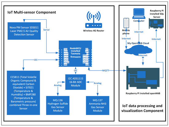 Multi-sensor integration in air quality monitoring transforms monitoring efforts from singular and limited perspectives to a comprehensive and dynamic approach, providing a deeper understanding of the intricate interplay between pollutants and environmental factors. The overall system architecture consists of two main components, as shown in Figure 1.