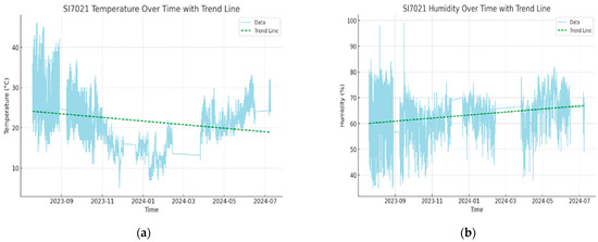 The charts show the time-series data collected from (a) SI7021 temperature and (b) SI7021 humidity. Each chart includes a blue line representing the raw data points, along with a green trend line that captures the overall direction of the data.