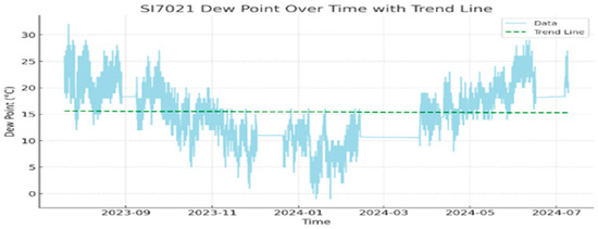 The time-series data collected from SI7021 dew point over time. The chart includes a blue line representing the raw data points, along with a green trend line that captures the overall direction of the data.