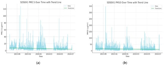 The charts show the time-series data collected from (a) SDS0X1 PM2.5 and (b) SDS0X1 PM10. Each chart includes a blue line representing the raw data points, along with a green trend line that captures the overall direction of the data.