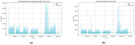 (a) Total volatile organic compounds and (b) carbon dioxide. Each chart includes a blue line representing the raw data points, along with a green trend line that captures the overall direction of the data.