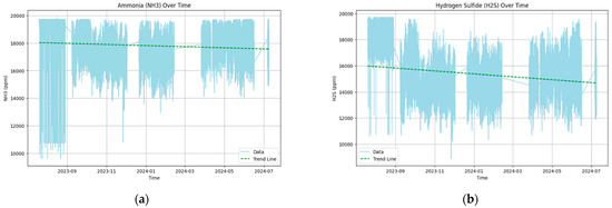 (a) Ammonia (NH3) over time and (b) hydrogen sulfide (H2S) over time. Each chart includes a blue line representing the raw data points, along with a green trend line that captures the overall direction of the data.