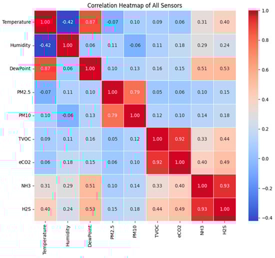 The correlations observed between temperature and dew point are positive (0.87) (Figure 8). This strong positive correlation is expected, as the dew point is directly influenced by temperature and humidity levels. When the temperature rises, the dew point also tends to increase, provided the moisture content in the air remains relatively stable. The correlation between PM2.5 and PM10 levels is notably high (0.79), indicating that these two measurements of particulate matter tend to move together. This is logical, as PM2.5 is a subset of PM10, and both are often influenced by similar sources, such as dust and other particulate-generating activities within the barn. TVOC and eCO2 also show a strong positive correlation (0.92), indicating that these two parameters are closely linked in the environment in the barn. This could be due to shared sources, such as animal respiration, waste management practices, and the use of certain chemicals used for milking devices and tanks’ cleaning. Another significant correlation is observed between NH3 and H2S, with a correlation coefficient of 0.93, both of which are odorous substances that significantly impact air quality and can affect the taste of animal products. A strong positive correlation between these gases suggests they often increase together, likely due to shared sources like animal waste. Temperature is also correlated with NH3 and H2S, implying that higher temperatures could exacerbate the presence of these gases.
