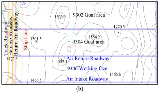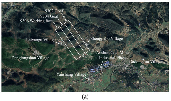 The overlying surface of Anshun Coal Mine’s mining area is characterized by fault-block tectonic low-to-mid-mountain topography, as shown in Figure 1a. Within this region, the 9304 and 9306 working faces are depicted in Figure 1b. The area exhibits multiple isolated peaks, with a relative surface height difference ranging from 0 to 152 m. The burial depth of the coal seam varies between 385 and 537 m, with an average thickness of 1.53 m. The coal seam dip angle is between 2° and 4°. The immediate roof of the coal seam is composed of carbonaceous claystone, with a thickness of 5.27 m. The main roof is composed of flint limestone, with a thickness of 4.79 m. The floor of the coal seam is made of clayey sandstone, with a thickness of 3.78 m.