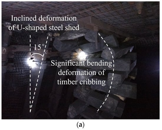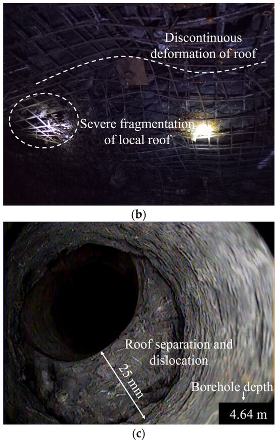 The effectiveness of GSER in the 9304 working face of Anshun Coal Mine: (a) deformation of support body in GSER; (b) fracture and fragmentation of the roof in GSER; (c) separation and dislocation of the roof in GSER.
