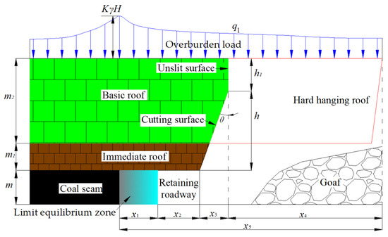 In the mechanical model, x1 represents the width of the limit equilibrium zone, m; x2 represents the width of the retained roadway, m; x3 represents the projected width of the cutting line in the horizontal direction, m; x4 represents the distance from the uncut top part to the end of the cantilever beam, m; x5 represents the distance from the limit equilibrium zone to the end of the cantilever beam, m; m represents the thickness of the coal seam, m; m1 is the thickness of the immediate roof, m; m2 represents the thickness of the main roof, m; h represents the cutting height, m; and h1 represents the height of the uncut top part, m. θ is the cutting angle, °; q1 represents the load above the cantilever beam, MPa; KγH represents the lateral supporting stress on the basic roof of the roadway, MPa; K represents the stress concentration factor; H represents the buried depth of the coal seam, m; and γ represents the bulk density of the rock, kN/m3.