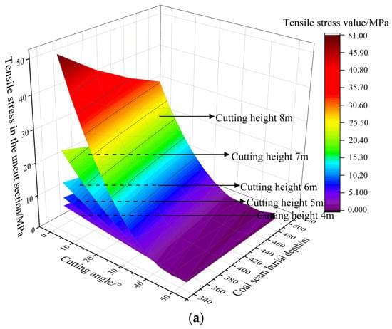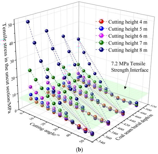 Analyzing Figure 5b, it can be seen that the tensile stress in the uncut part of the main roof is comprehensively influenced by the burial depth of the coal seam, the cutting height, and the cutting angle. Analyzing the state of sufficient roof cutting, where the tensile stress in the uncut part of the main roof is greater than the tensile strength, we find that when the cutting angle and cutting height are kept constant, for every 50 m decrease in the coal seam burial depth within the range from 350 m to 500 m, the tensile stress in the uncut part of the main roof will increase by approximately 16%–27%. The increase becomes more significant with the decrease in cutting angle and the increase in cutting height. When the coal seam burial depth and cutting angle are kept constant, for every 1 m increase in the cutting height within the range from 4 m to 8 m, the tensile stress in the uncut part of the main roof will increase by approximately 28%–54%. The increase becomes more significant with the decrease in coal seam burial depth and the increase in cutting angle. When the coal seam burial depth and cutting height are kept constant, for every 5° decrease in the cutting angle within the range from 0° to 50°, the tensile stress in the uncut part of the main roof will increase by approximately 20%–35%. The increase becomes more significant with the decrease in coal seam burial depth and the increase in cutting height. Judging from the increase in tensile stress in the uncut part of the main roof, the overall impact of the cutting height is relatively significant, followed by the cutting angle. The burial depth of the coal seam also has an impact on the tensile stress of the main roof, especially in relatively shallow burial depth areas. Considering that actual cutting parameters are usually selected as integers, under different burial depth conditions, we can fix the cutting height and cutting angle as integers and further study the critical value and reasonable range of key cutting parameters by taking the tensile strength of the main roof as the threshold.