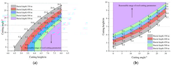 Reasonable range of critical cutting parameters under different burial depths based on the critical tensile strength of the main roof: (a) fix the cutting height as an integer; (b) fix the cutting angle as an integer.