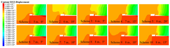 Vertical displacement nephogram of the surrounding rock in the gob-side entry retaining section corresponding to different numerical simulation schemes.