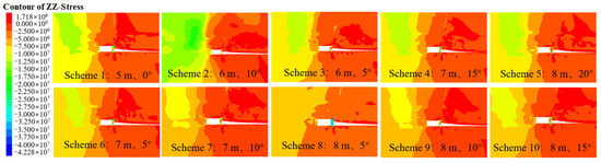 The deformation and stress distribution of the surrounding rock along the gob-side entry retention under different roof-cutting schemes are shown in Figure 8 and Figure 9. As can be seen from Figure 8, after the roof cutting and entry retaining, a distinct fracture line is formed along the cutting line of the roof, and there is a significant difference in vertical displacement between the two sides of the fracture line, indicating that the cantilever structure of the roadway roof has been effectively cut off through roof cutting and pre-splitting, thus playing a role in controlling the displacement of the surrounding rock of the roadway. Among them, the subsidence of the roadway roof near the goaf side is significantly greater than that of the solid coal side, showing a trapezoidal subsidence state. Therefore, reinforcement support is needed on the side of the gob-side entry retention near the goaf to achieve overall stability control of the roadway roof.