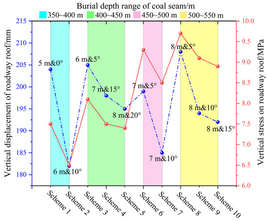In the numerical simulation, measuring lines were arranged above the coal seam using the built-in commands of FLAC3D to monitor the vertical stress, vertical displacement, and lateral supporting stress of the gob-side entry retaining roof. Specifically, the monitoring lines for roof stress and lateral supporting stress of the roadway were horizontally arranged at the intersection of the basic roof and the immediate roof of the roadway, i.e., 5.3 m above the coal seam. The displacement monitoring line was horizontally arranged below the immediate roof, i.e., on the surface of the roadway. The peak values of roof vertical displacement and vertical stress from each numerical simulation scenario were extracted and plotted in Figure 10. An analysis of Figure 10 reveals that within the same burial depth range, achieving complete roof cutting is more feasible by increasing the cutting height and decreasing the cutting angle. Comparing scenarios 3, 4, and 5, as the cutting height increases, the selectable range of cutting angles gradually widens, and the displacement and stress peak of the retained roadway roof gradually decrease, albeit with diminishing returns. Therefore, the benefits gained from increasing the cutting height gradually diminish. Within the same burial depth range, as the cutting angle increases, the vertical stress shifts towards the solid coal side, and both the vertical displacement and stress peak of the retained roadway roof show a decreasing trend, albeit with diminishing reductions. When comparing various scenarios, the maximum displacement and stress peak of the roof are significantly larger when the cutting angle is 0° or 5°, indicating that smaller cutting angles result in greater sliding resistance between the cuts, making it difficult for the gob-side roof to collapse completely under dynamic pressure. Additionally, the deflection of the roof cantilever structure contributes to larger displacement and stress on the retained roadway roof. As the cutting angle increases, the peak stress concentration on the solid coal side gradually increases, suggesting that blindly increasing the cutting angle does not continuously enhance the benefits. Furthermore, due to field construction constraints, increasing the cutting angle prolongs the drilling cycle, significantly affecting the progress of underground roof-cutting and pre-splitting projects.