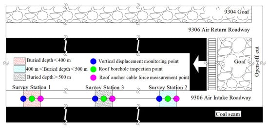 Incorporating the aforementioned research, the engineering practice of roof cutting and roadway retention was implemented in different burial depth sections of the intake roadway at the 9306 working face. Schemes ②, ⑦, and ⑨ were selected for monitoring the stability of surrounding rock in the retained roadway with roof cutting, targeting sections with burial depths of less than 400 m, between 400 m and 500 m, and greater than 500 m, respectively. The cross-sectional deformation of the roadway was monitored using the cross-sectional layout method, while the tension of anchor cables was collected with an anchor cable dynamometer. A borehole camera was employed to detect the internal fracture condition of the roof. The overall stability of the roadway cross-section was assessed by observing the deformation degree of the support structure. Based on the aforementioned four monitoring results, an evaluation of the final roadway retention effect at the 9306 working face was conducted. The on-site monitoring arrangement is illustrated in Figure 11.
